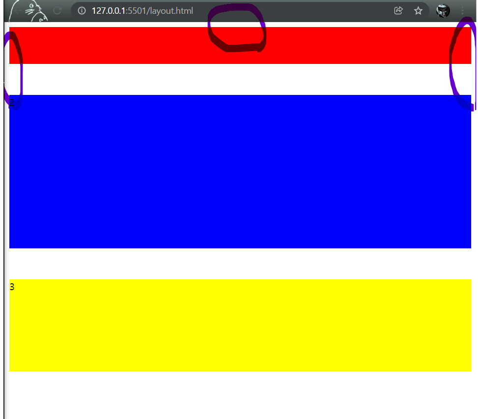 코드 실행 결과 나타난 웹페이지의 모습을 보면 설정한 margin 값 이외에 표시된 부분처럼 화면의 가장자리에 빈 공간이 있는 것을 볼 수 있다. 이러한 빈 공간을 없애는 것 역시 margin을 활용하여 가능하다.