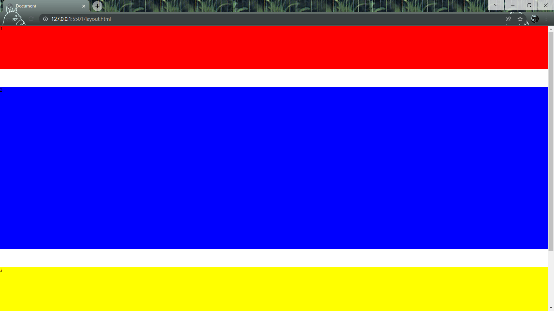 추가된 것은 *{ } 부분이다. 여기서 * 선택자에 대해 하나 더 알고 넘어가자. * 선택자는 모든 엘리먼트를 뜻하는 선택자이다. 따라서 *{ font-size: 12px; margin: 0; } 코드에 의해 모든 엘리먼트의 폰트 사이즈가 12px이 되고 모든 가장자리가 빈 공간 없이(margin 값이 0) 채워짐을 알 수 있다.
