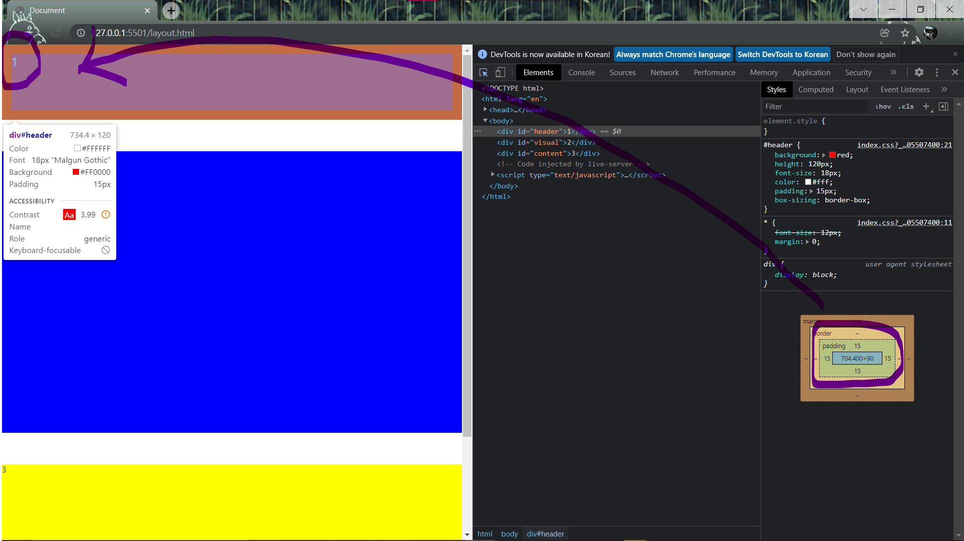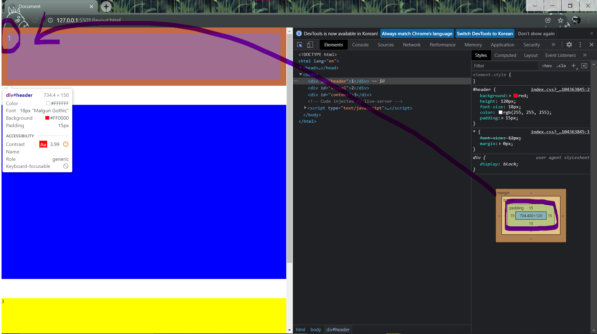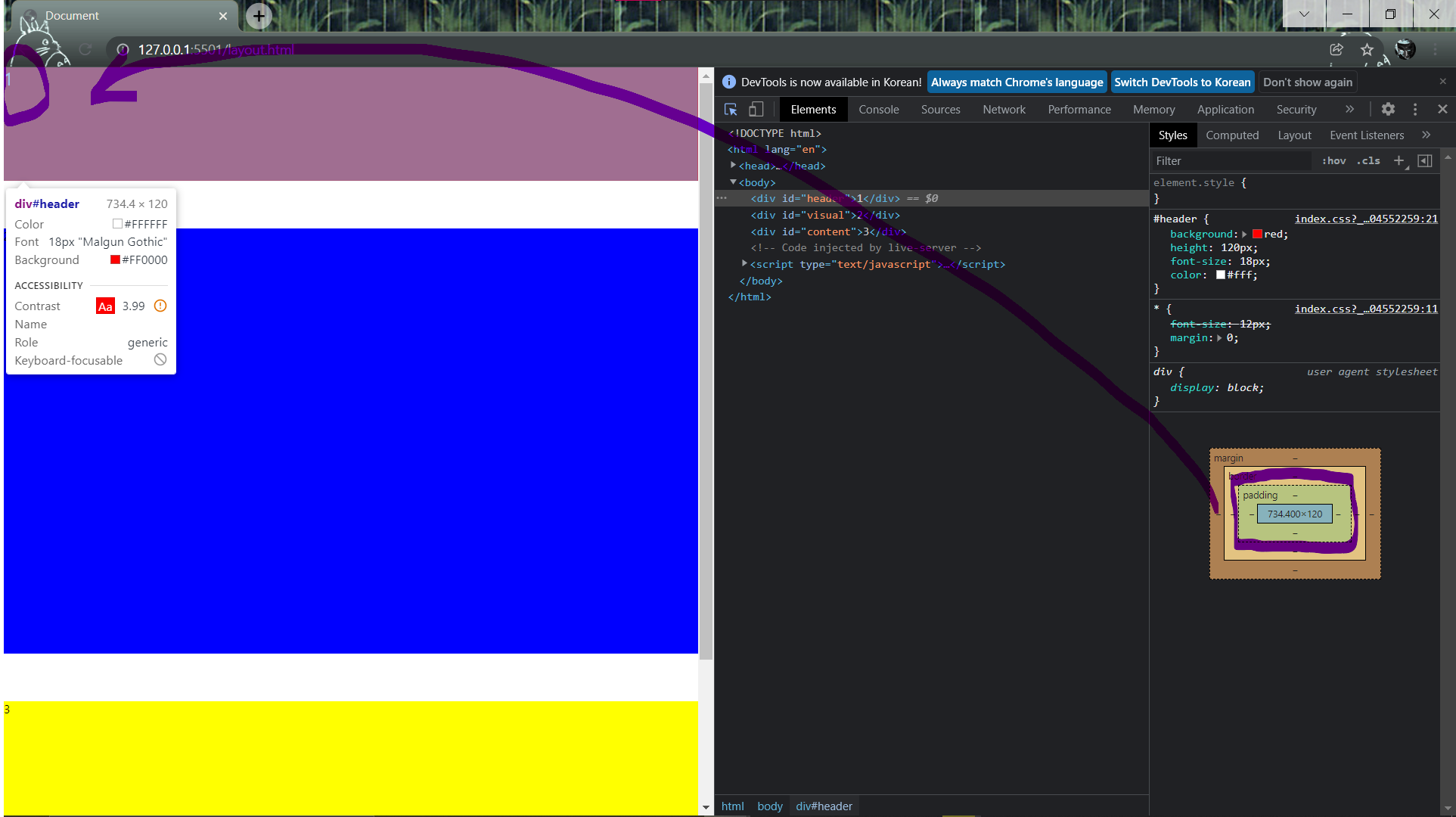 <div id="header">1</div>엘리먼트의 영역에 해당하는 내용들이 왼쪽 상단 끝에서부터 시작되는 것을 확인할 수 있다. 또한 빨간 영역의 높이(height)가 120px임을 확인할 수 있다. 여기서 해당 영역의 내용인 1이라는 숫자를 조금 띄어서 쓰고 싶을 때 padding을 사용해 볼 수 있다.