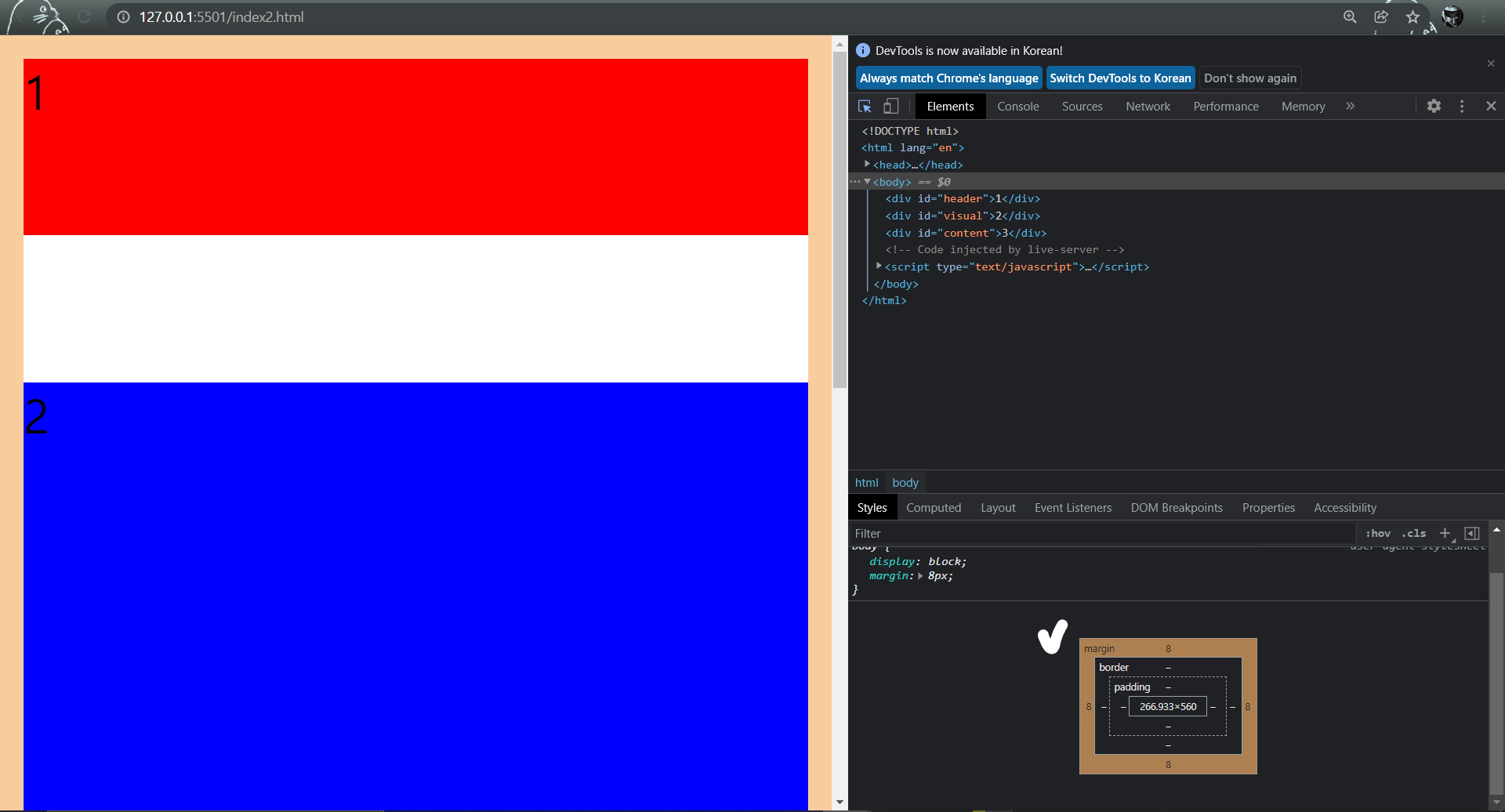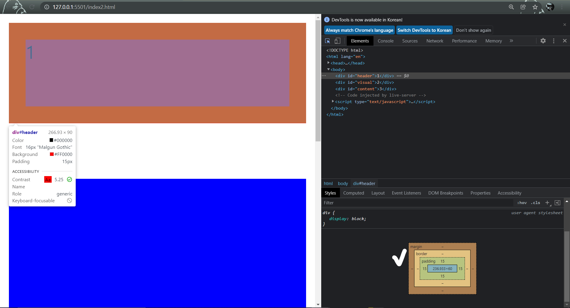해당 코드의 실행 결과를 참조하여 css의 속성들에 대해 알아보도록 하겠다.