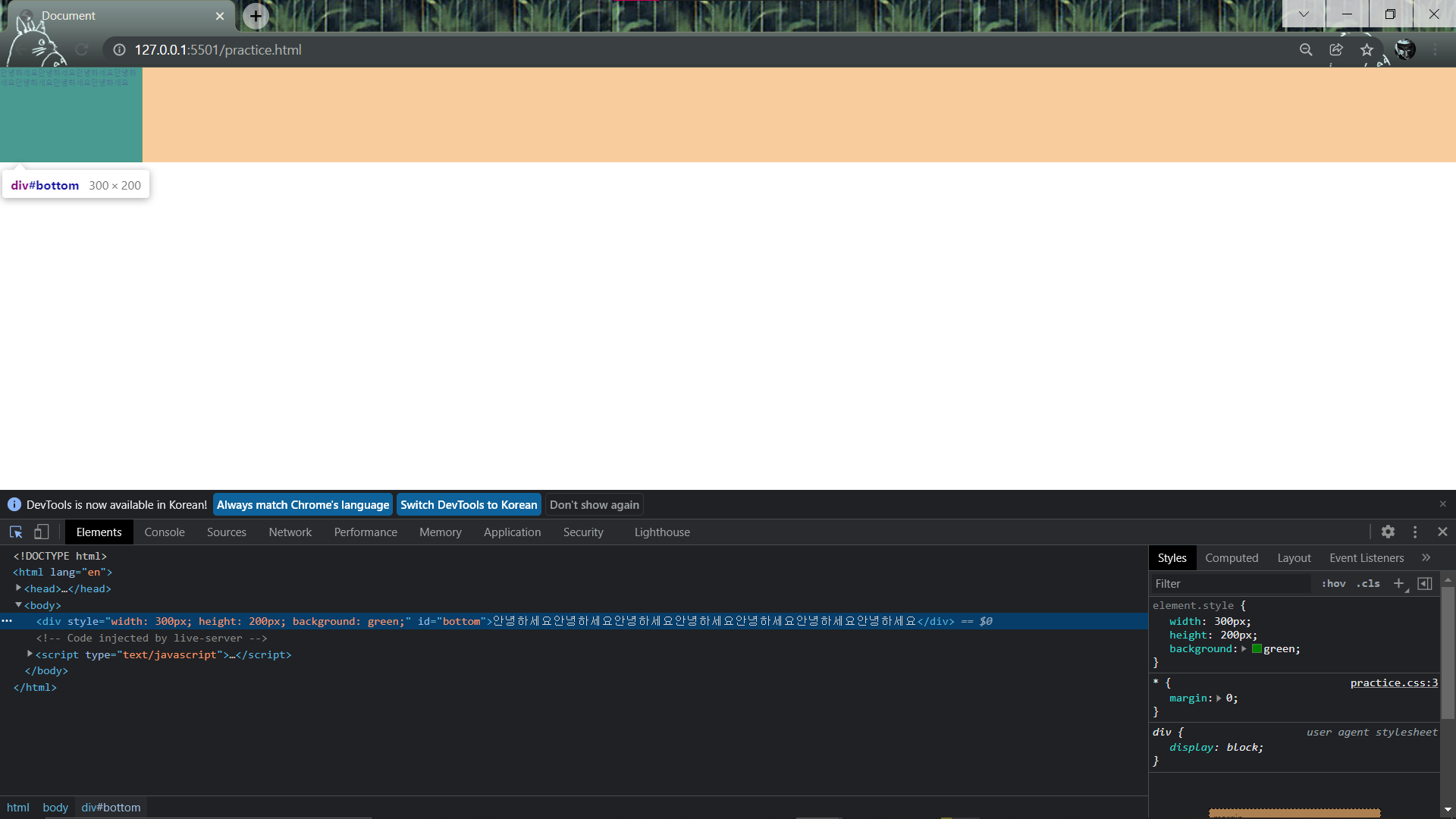<div style="width: 300px; height: 200px; background: green;" id="bottom">안녕하세요안녕하세요안녕하세요안녕하세요안녕하세요안녕하세요안녕하세요</div>