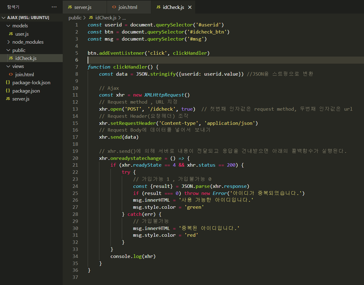 이제 코드를 살펴보면서 Ajax를 어떻게 구현하는지 알아보도록 하자. Ajax를 사용해 만들어 볼 기능은 회원가입을 할 때 흔히 나오게 되는 아이디 중복체크 기능이다. 메인 실행 파일인 server.js 파일 , 회원가입 페이지를 구성하는 join.html 파일 , Ajax 기능이 구현되어 있는 idCheck.js 파일 , 회원정보가 담겨있는 user.js 파일은 각각 다음과 같다.