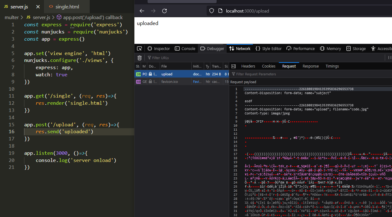 upload.single( ) 함수의 인자값으로는 html 파일에서 작성한 파일 업로드 input 박스의 name값을 넣어주면 된다. html 파일을 살펴보면 <form>엘리먼트의 속성값이 method="post" , action="/upload"인 것을 알 수 있다. 따라서 다음과 같은 라우터를 만들어서 실행해주면 된다.