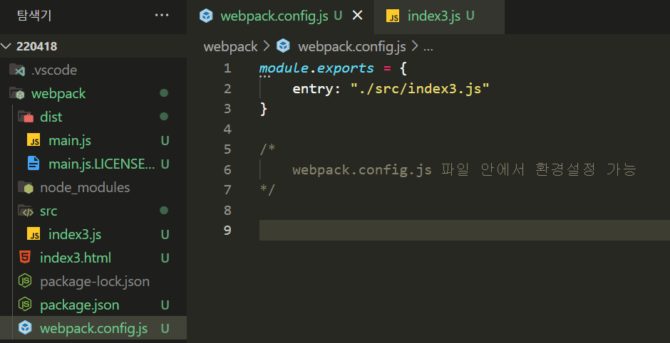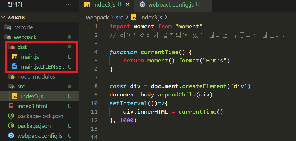 위와 같이 index3.js 파일 안에 moment 모듈을 불러와서 작성된 코드가 있다고 했을 때 webpack은 index3.js 파일의 내용과 moment 모듈에 있는 내용을 합쳐서 하나의 js파일을 만들어주게 된다. npx webpack-cli ./src/index3.js 명령어에 의해 dist 디렉토리 안에 bundle 파일을 생성해주는 것이다. 이 때 bundle 파일이 생성되는 디폴트 디렉토리명은 dist 이다. webpack에서는 이러한 세팅값들을 webpack.config.js 파일을 통해 변경하는 것 역시 가능하다.