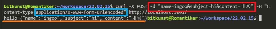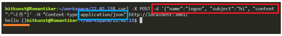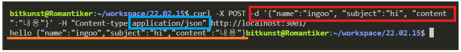 -d '{"name":"ingoo", "subject":"hi", "content":"내용"}' \