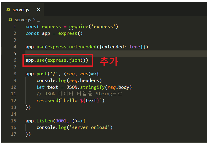 server.js 파일 안에 해당 코드를 추가해서 JSON 타입의 데이터를 처리할 수 있도록 하자.